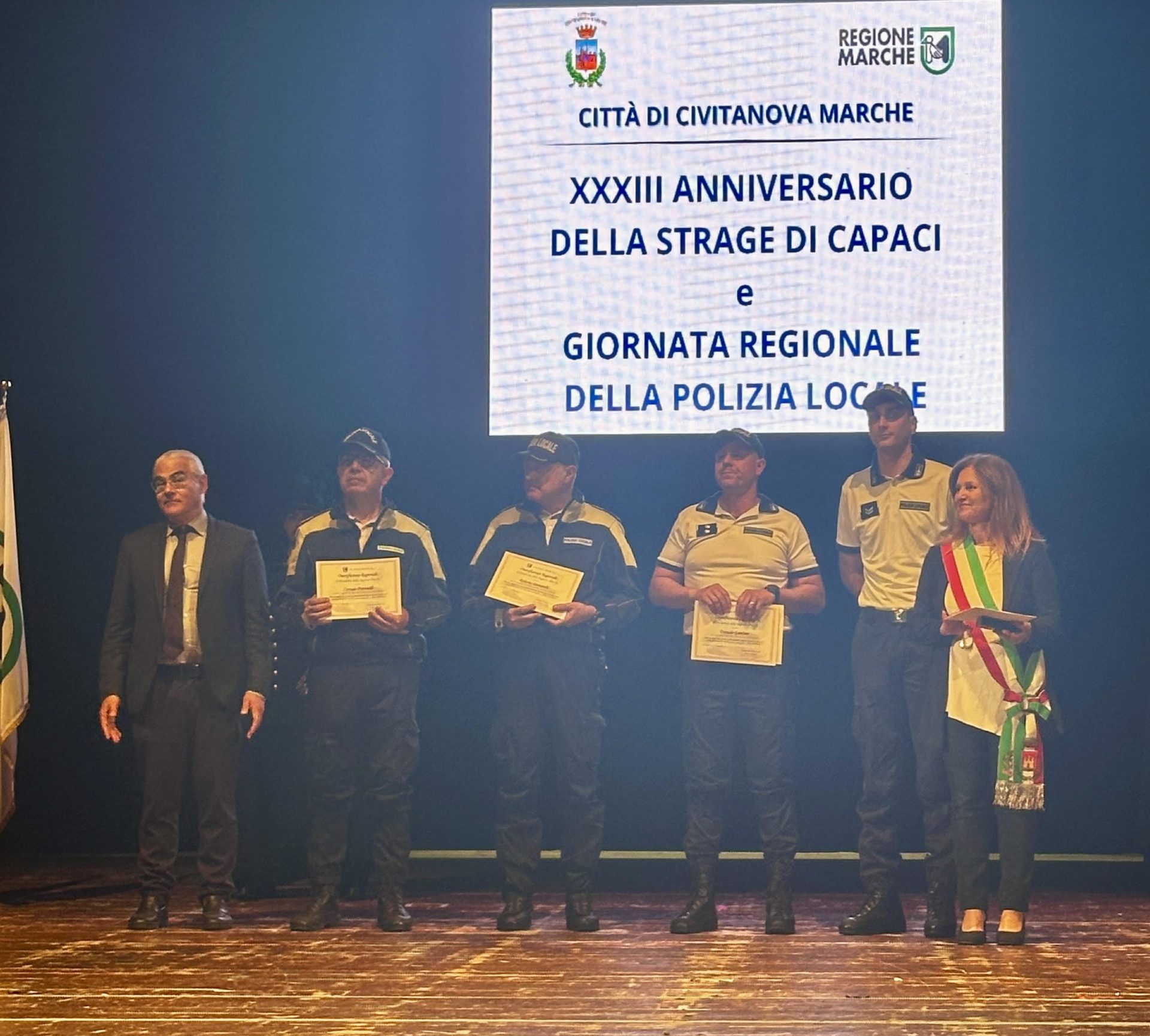 In occasione della tradizionale festa della Polizia Locale organizzata stamattina a Civitanova dalla Regione Marche in concomitanza con il XXXIII anniversario della strage di Capaci, la Polizia locale di Castelfidardo ha ricevuto importanti gratificazioni per il decimo anno consecutivo. Ben sette gli agenti, accompagnati dal vicesindaco Romina Calvani, che hanno meritato il conferimento dell’encomio destinato al personale che si è distinto in speciali operazioni di polizia superando l’ordinario compimento dei doveri del proprio ufficio.