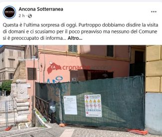 A renderlo noto con un post sui Social per avvisare ulteriormente tutti i visitatori che domani avrebbero voluto partecipare alla “Domenica ad Anconasotterranea”, sono gli organizzatori di “Ancona Sotterranea” che scrivono, corredando il post con tanto di foto: «Questa è l’ultima sorpresa di oggi. Purtroppo dobbiamo disdire la visita di domani e ci scusiamo per il poco preavviso ma nessuno del Comune si è preoccupato di informarci che avrebbero chiuso l’accesso. Al momento quindi le future visite sono tutte annullate e ci dispiace molto ma purtroppo non dipende da noi».
