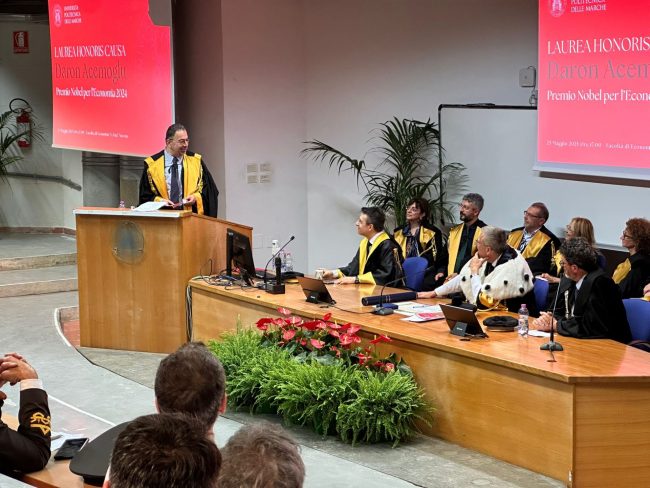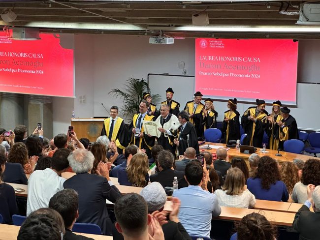 Si è tenuta ieri pomeriggio ad Ancona la cerimonia di Conferimento della Laurea Honoris Causa a Daron Acemoglu, Premio Nobel per l’Economia 2024, alla Facoltà di Economia “G.Fuà”, dell’Università Politecnica delle Marche, in un’aula gremita di persone, docenti, studentesse e studenti.