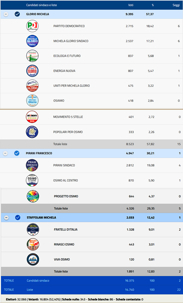 Nella parte dell’emiciclo destinato alla minoranza entreranno con il candidato sindaco Francesco Pirani 4 consiglieri della lista ‘Pirani Sindaco’ e uno di ‘Osimo al Centro’ (è rimasto fuori ‘Progetto Osimo’, poi con la candidata sindaca Michela Staffolani e altri 2 consiglieri comunali di Fratelli d’Italia (non ha eletto consiglieri ‘Rinasci Osimo’ e ‘Viva Osimo’).