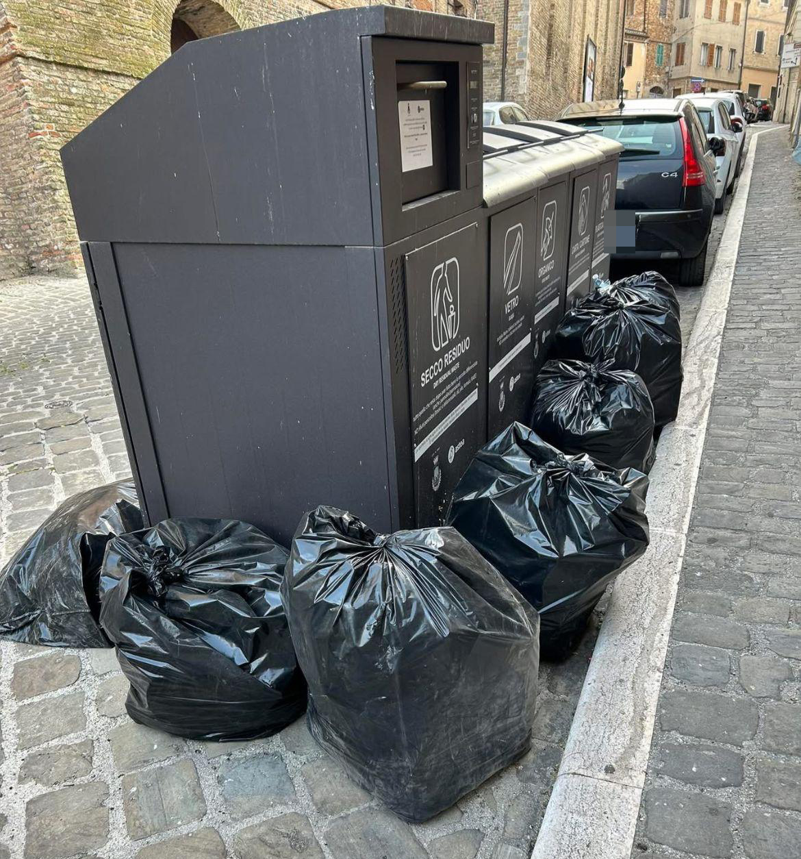 Si presentava così stamattina una delle isole ecologiche di via Matteotti, nel rione di San Marco di Osimo, in pieno centro storico: sacchi della spazzatura in strada, fuori dai cassonetti. «Osimo discarica a cielo aperto: è ora di intervenire. -scrive in una nota il movimento civico Rinasci Osimo – Le segnalazioni continuano ad arrivare, e non possiamo ignorarle. Noi di Rinasci Osimo lo diciamo da tempo: i cassonetti attuali non garantiscono un servizio adeguato, e le conseguenze sono sotto gli occhi di tutti. Abbiamo immaginato un’Osimo più pulita, curata e accogliente. Una città dove il rispetto per l’ambiente e per i cittadini sia una priorità. Ora chiediamo all’Amministrazione comunale di affrontare il problema con urgenza, per far sì che il centro storico si riprenda la sua dignità».