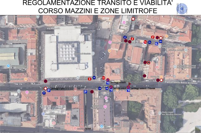 Nel dettaglio vengono istituite sosta e fermata in Corso Mazzini tratto compreso tra via Marsala e via Castelfidardo, lato destro con parcheggi a spina con divieto di sosta eccetto veicoli Tribunale muniti di permesso nei giorni feriali dalle 8 alle 14, eccetto residenti settore centro e spina dei corsi nei giorni feriali dalle 14 alle 8, eccetto residenti settore centro e spina dei corsi nei giorni festivi dalle 0.00 alle 24. In Corso Mazzini tratto compreso tra via Marsala e via Castelfidardo, lato sinistro sarà vigente il divieto di sosta e fermata; in Corso Mazzini tratto compreso tra il civico 97 e il civico 158, ambo i lati, il divieto di sosta eccetto residenti settore centro e spina dei corsi mentre nel tratto compreso tra il civico. 160 e piazza Cavour, lato destro, viene disposto il divieto di sosta eccetto veicoli Tribunale muniti di permesso nei giorni feriali dalle 8 alle 14, eccetto residenti settore centro e spina dei corsi nei giorni feriali dalle 14 alle 8, eccetto residenti settore centro e spina dei corsi nei giorni festivi dalle 0:00 alle 24.