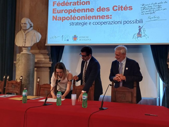 «Sono lieto che il comune di Ancona si unisca alla rete che ho fondato 21 anni fa quando ero sindaco di Ajaccio per riunire le città “segnate” dalla storia napoleonica. Una rete al sevizio dei cittadini per sviluppare progetti comuni: itinerari tematici, focus storici e traino turistico sostenibile. Riscoprire questa pagina di storia e condividerla crea connessioni tra città e rafforza l’Europa. Capire i conflitti passati aiuta a creare connessioni di pace». Lo ha detto questa mattina, in collegamento video con la sala conferenze della Loggia dei Mercanti di Ancona, Charles Bonaparte, presidente onorario della Federazione europea delle città napoleoniche. Poco fa infatti il sindaco Daniele Silvetti e Eleonora Berti, direttrice della Fecn hanno firmato stamattina il Protocollo di adesione del Comune alla Federazione europea delle città napoleoniche.