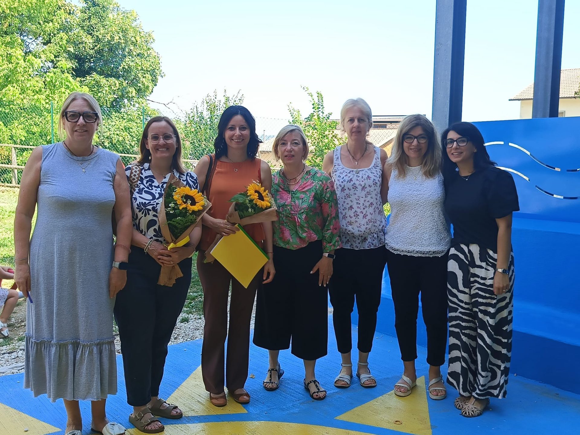 Michela Glorio e Simonetta Tirroni (rispettivamente terza e seconda da sin) in visita alla scuola materna del Borgo