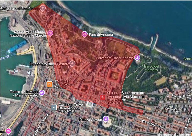 Le vie interessate sono: Via Volturno, Via Baldoni, Via Villarey, Via Indipendenza, Via Cardeto, Via Matteotti dal civico 1 al civico 137, dal civico 2 al civico 92, Piazza Malatesta, Via Goito, Via Magenta, Via Carducci (da Via Magenta a Via Matteotti), Via Marsala 173, Piazza delle Erbe, Via Lazzaro Bernabei dal civico 19 al civico 41, dal civico 18 al civico 30, Piazza del Plebiscito 19, Piazzale Martelli, Via Elia, Via delle Cavorchie, Via Oddo di Biagio, Largo Belvedere, Via Scosciacavalli, Vicolo San Gaetano, Vicolo del Solitario, Via del Faro, Via Ospizio, Via don Giuseppe Birarelli, Vicolo dei Tribunali, Via del Guasco, Via Papa Giovanni XXIII, Piazzale del Duomo, Scalone Nappi, Via Pio II, Piazza del Senato, Via Gabriele Ferretti Via Ciriaco Pizzecolli dal civico 17 e dal civico 34, Vicolo della Storta, Via Nicola Matas, Via Giorgio Orsini, Via Manfredo Fanti, Vicolo Stelluto, Via San Pietro, Via Alessandro Zappata, Piazza Lorenzo Cappelli, Via Isonzo 4