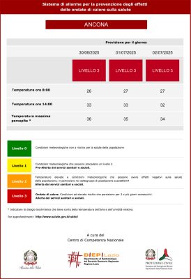 Sarà caldo da bollino rosso almeno per i prossimi 2 giorni ad Ancona. Il ministero della Salute e la Protezione civile regionale, nel loro bollettino di ieri, hanno inserito il capoluogo di regione  tra le città “in rosso” anche per domani insieme a Macerata, Fermo, Ascoli, Jesi e Fabriano.