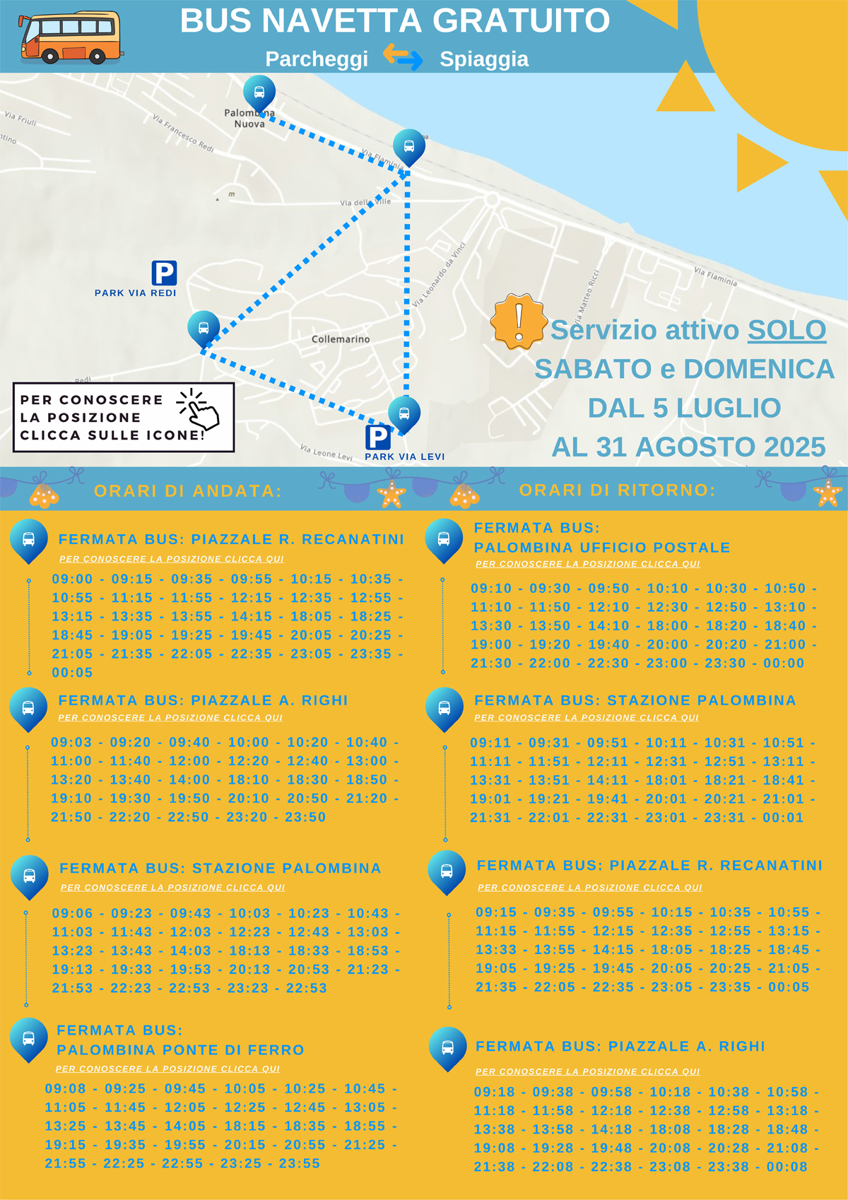 Il servizio di collegamento tra i due parcheggi e le spiagge di Palombina prenderà avvio nelle giornate di sabato e domenica dal 5 luglio prossimo e fino al 31 agosto 2025 per 18 giornate, dalle ore 9 alle ore 00:00, e questo servizio sarà essere effettuato con mezzi autorizzati al trasporto pubblico locale sul seguente itinerario: Parcheggio via Redi – Parcheggio via Levi – Stazione Palombina – Poste Palombina e ritorno. Gli orari e il percorso potranno subire modifiche in accordo tra Amministrazione e Conerobus, anche in relazione ai riscontri che si avranno durante l’effettuazione del servizio.