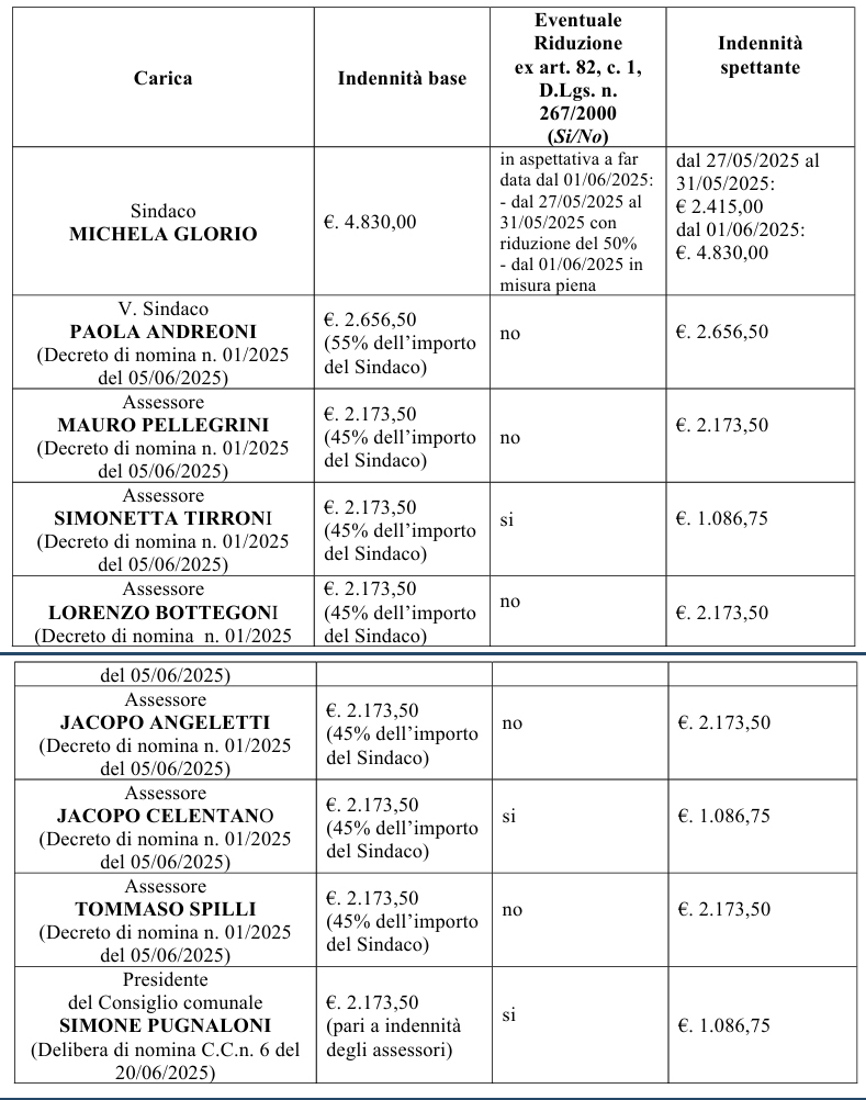 La misura della indennità prevista per il vicesindaco e per gli assessori è rapportata percentualmente a quella stabilita per il sindaco ed è dimezzata per i lavoratori dipendenti che non abbiano richiesto l’aspettativa. A decorrere dal 2024 l’indennità di funzione dei sindaci è parametrata al trattamento economico complessivo vigente dei presidenti delle Regioni, in misura percentuale a seconda della dimensione demografica dei Comuni. Nel caso di Osimo, con popolazione da 30.001 a 50.000 abitanti questa percentuale è pari al 35% del compenso del governatore delle Marche che si traduce per la sindaca Michela Glorio in 4.830 euro mensili lordi, a partire dal 1 giugno, quando è entrata in aspettativa dal lavoro. Alla vice sindaco Paola Andreoni spetta invece il 55% dell’importo fissato per il primo cittadino, vale a dire 2.656 euro lordi mensili.