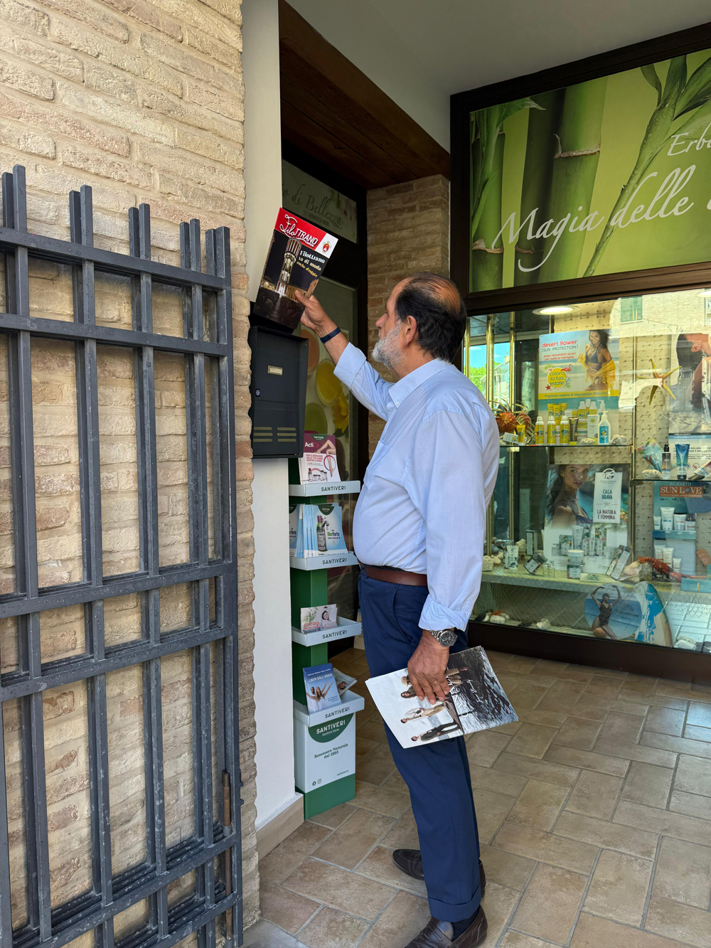 Il consigliere comunale di maggioranza Cusini mentre consegna nelle cassette postali il magazine Filottrano Notizie