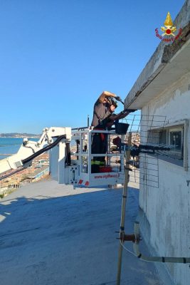 La squadra di Ancona, con l’ausilio di una piattaforma aerea per il sollevamento di persone, ha provveduto alla rimozione delle parti pericolanti, compresi alcuni cavi elettrici, mettendo in sicurezza le aree sottostanti.