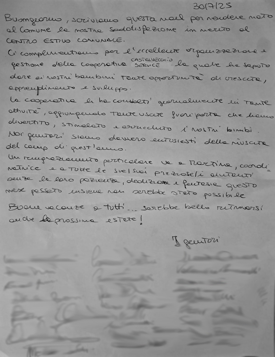 La lettera con le parole di ringraziamento firmata dai genitori dei bimbi di Fabriano che hanno ferquentato il centro estivo comunale