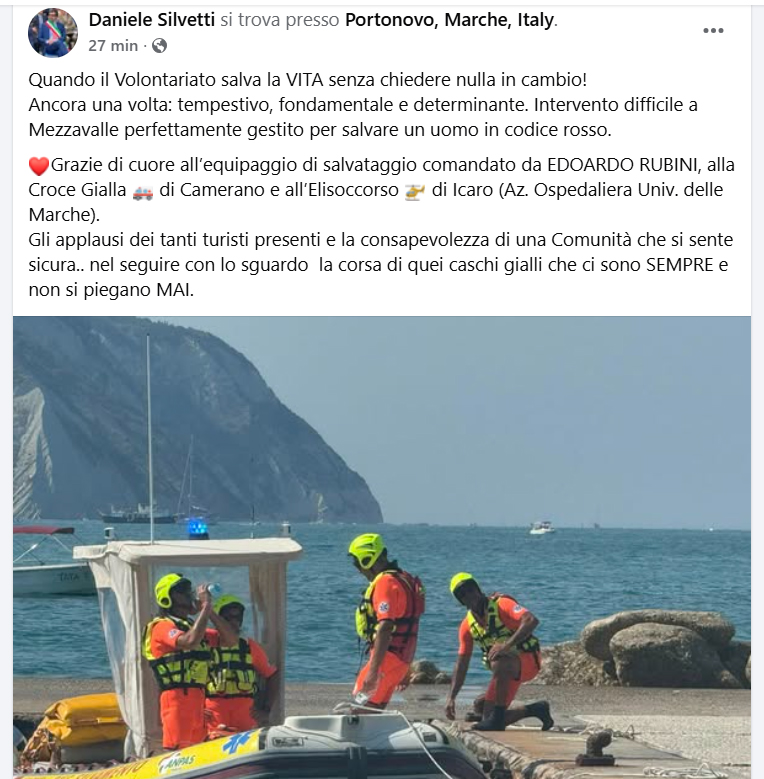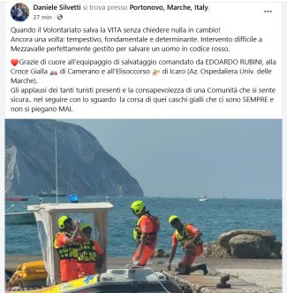 A tutta la squadra dei soccorritori sono andati il plauso e le parole di gratitudine dei sindaco di Ancona. «Quando il volontariato salva la vita senza chiedere nulla in cambio! – ha scritto sui social Daniele Silvetti – Ancora una volta: tempestivo, fondamentale e determinante. Intervento difficile a Mezzavalle perfettamente gestito per salvare un uomo in codice rosso. Grazie di cuore all’equipaggio di salvataggio comandato da Edoardo Rubini, alla Croce Gialla di Camerano e all’elisoccorso di Icaro dell’Azienda Ospedaliera Universitaria0 delle Marche. Gli applausi dei tanti turisti presenti e la consapevolezza di una Comunità che si sente sicura.. nel seguire con lo sguardo la corsa di quei caschi gialli che ci sono sempre e non si piegano mai».
