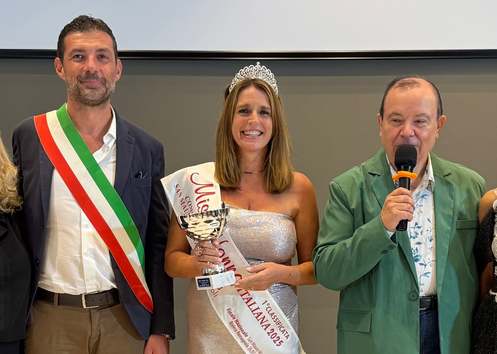 Manila Mariani “Miss Nonna 2025”; il patron di Miss Nonna Paolo Teti ed il sindaco di San Mauro Pascoli Moris Guidi