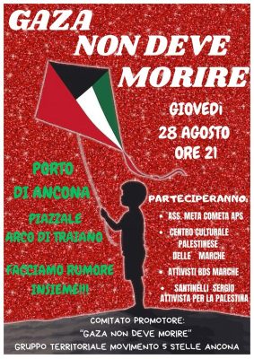 Nuova manifestazione al porto di Ancona per mobilitarsi ed esprimere solidarietà per l’emergenza umanitaria palestinese. “Gaza non deve morire” è il titolo dell’iniziativa organizzata per giovedì prossimo, 28 agosto, alle ore 21, davanti all’Arco di Traiano. Un appuntamento promosso dal Comitato “Gaza non deve morire” con il Gruppo territoriale M5S Ancona, e la partecipazione delle associazioni Meta Cometa, Centro culturale palestinese delle Marche, attivisti Bbs Marche e di Sergio Santinelli, attivista per la Palestina.