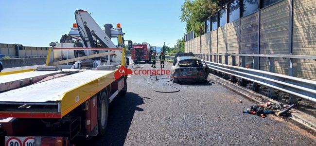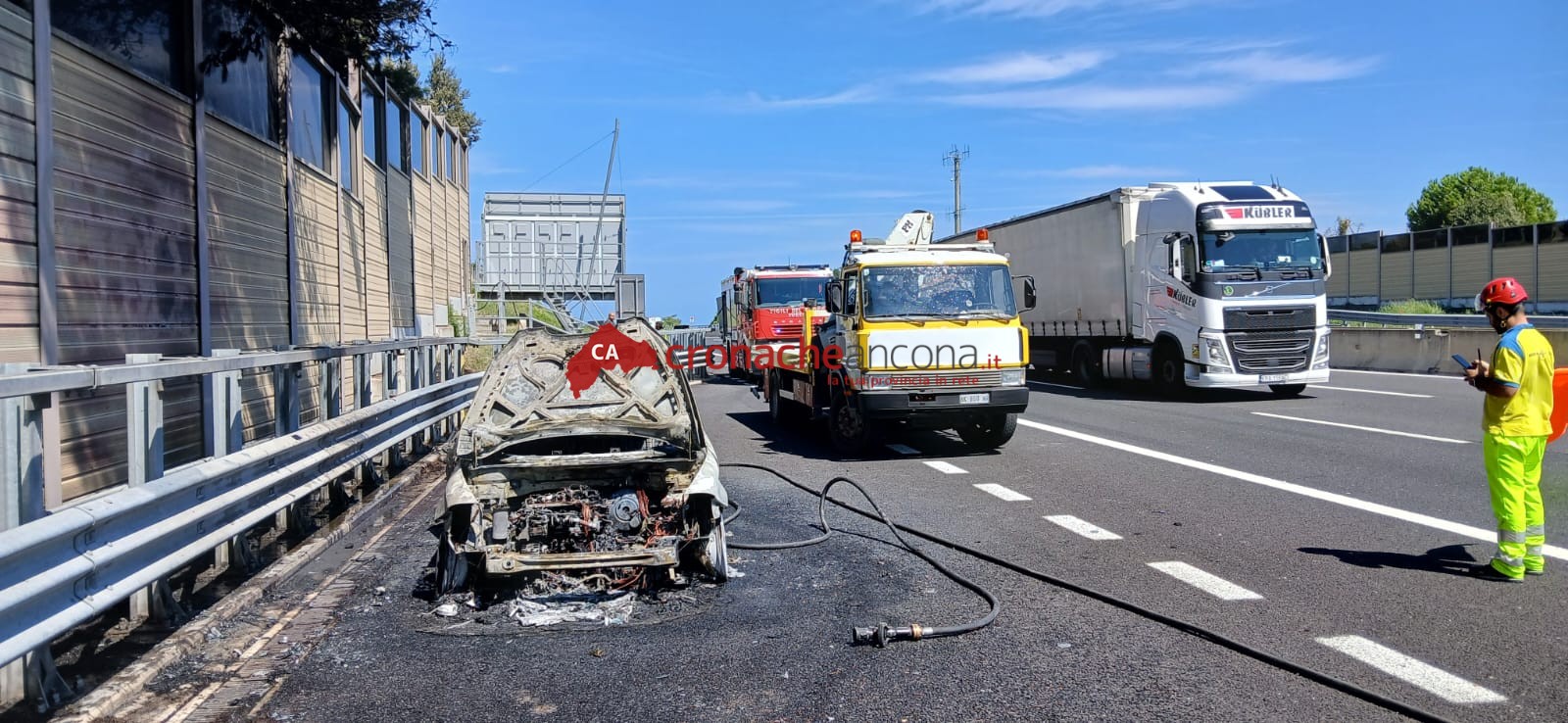 Auto a fuoco all’altezza del km 260 dell’A14, tra Loreto e Civitanova Marche, nel territorio Maceratese.