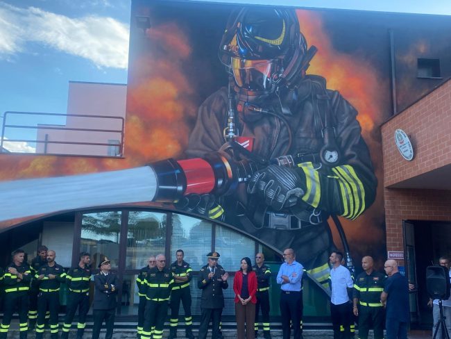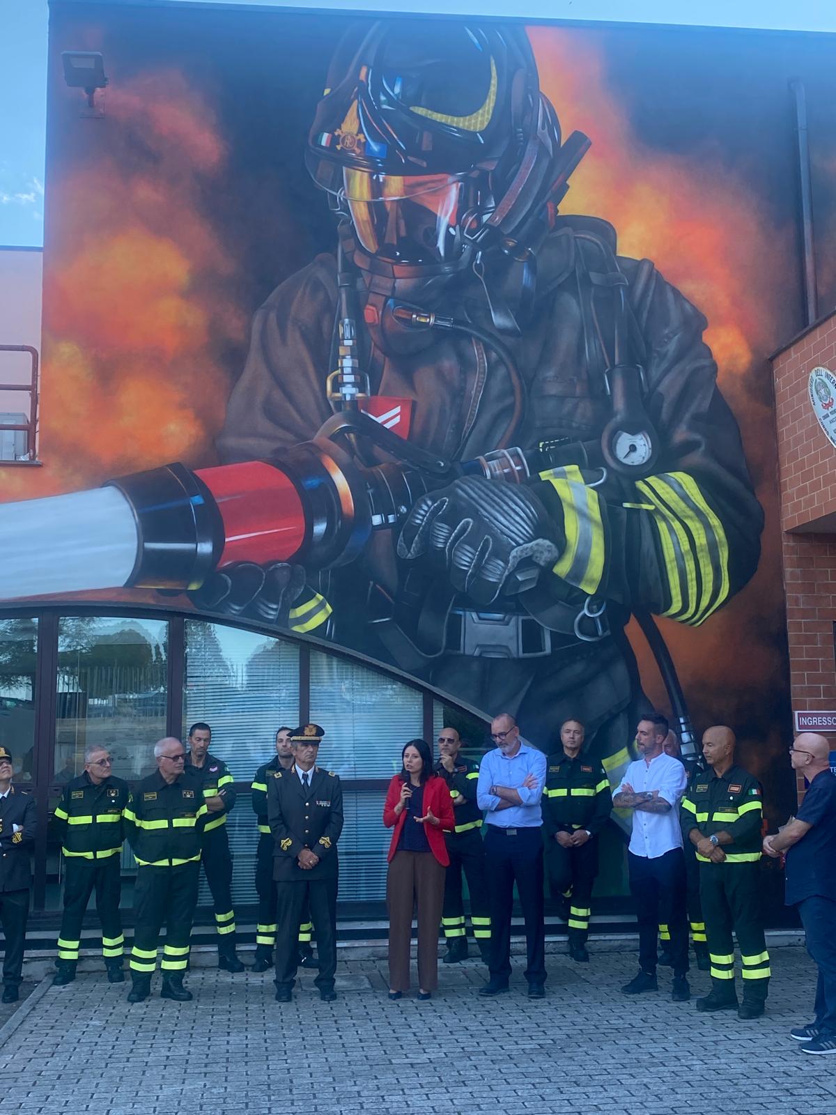 Il murale realizzato da Federico Zenobi inaugurato ieri pomeriggio al distaccamento dei vigili del fuoco di Osimo