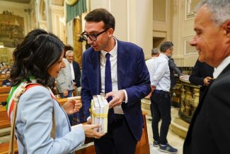 La sindaca con un delegato di Copertino (Puglia), città natale del Santo