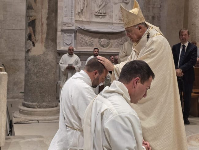 «Prendetevi cura di tutti, in particolare dei giovani, questa sera qui ne vedo tanti, sono venuti per voi, state loro accanto perché non gli venga rubata la speranza». È l’invito rivolto dall’arcivescovo a Jacopo Maglioni e David Baiocchi che ieri, sabato 27 settembre, alle ore 21 nella Cattedrale di San Ciriaco, sono stati ordinati sacerdoti per l’imposizione delle mani e la preghiera consacratoria di mons. Angelo Spina. «È stato un momento di festa e di speranza per tutta la comunità diocesana. – sottolinea un nota dell’Arcidiocesi di Ancona-Osimo – Questi due giovani, dopo un lungo cammino di discernimento, formazione e preghiera, hanno scelto di donare la loro vita interamente a Dio e al servizio del suo popolo. Con coraggio e fede, hanno deciso di rispondere alla chiamata del Signore e hanno pronunciato il loro “sì per sempre“: un sì che è segno di amore, fedeltà e piena disponibilità. Non si tratta di una rinuncia, ma di una scelta d’amore, che nasce da un incontro profondo con Cristo e dal desiderio di seguirlo senza riserve. È una testimonianza che parla al cuore di tutti: è possibile vivere per qualcosa di grande, spendersi per gli altri, e trovare gioia in una vocazione che abbraccia tutta la vita.