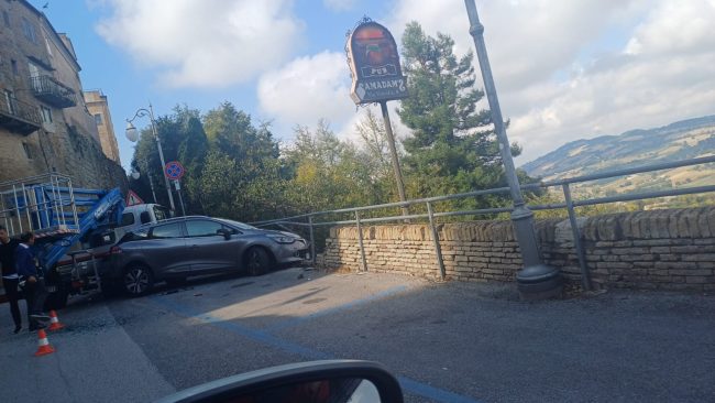 L’auto scaraventata sul muretto di via Fontemagna dopo essere stata agganciata dal braccio meccanico di una piattaforma aerea in transito