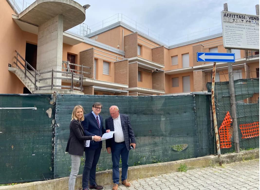 da sin. Monica Bordoni, Dino Latini e Stefano Gatto (Erap) ad aprile 2024 davanti all’ex scuola di Osimo Stazione che l’Erap vorrebbe riqualificare in 29 appartamenti riservati alle famiglie, ai giovani, alle giovani coppie con Isee fino a 34 mila euro l’anno