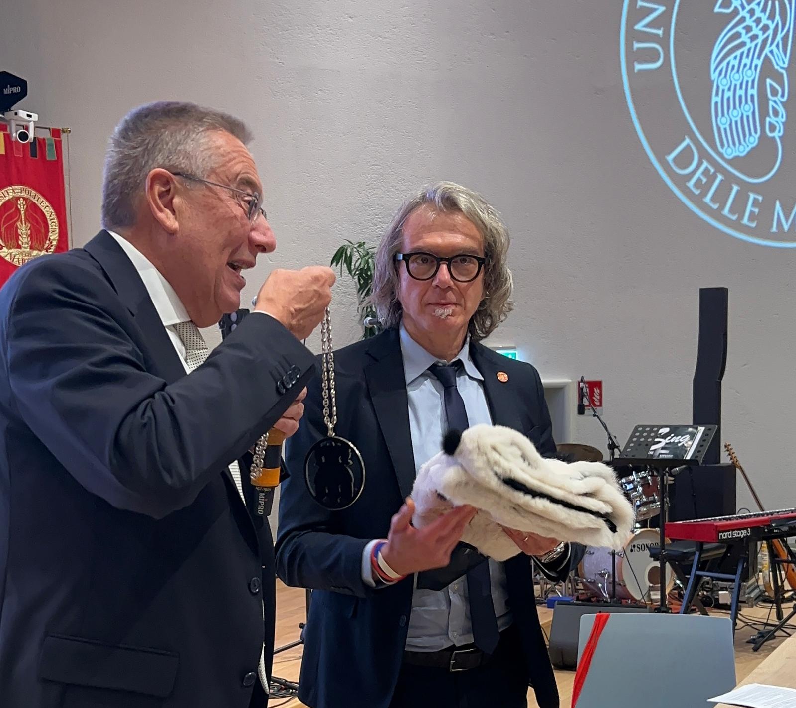 Nel suo intervento iniziale, Quagliarini ha ringraziato la famiglia e i collaboratori che – lo mostra – gli hanno donato un ermellino, simbolo del suo percorso all’università.