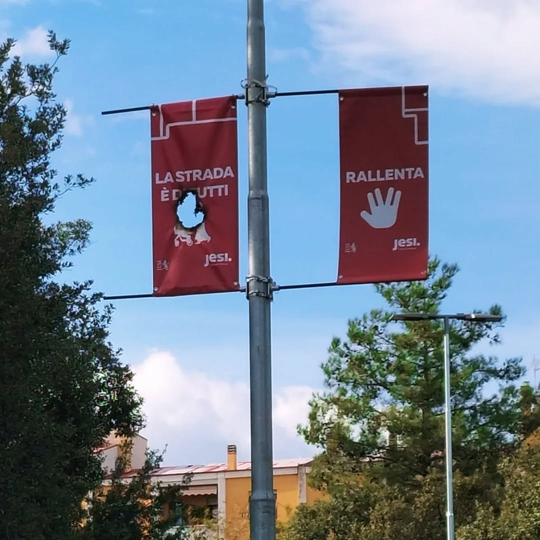 La bandiera della campagna per la sicurezza stradale bruciata a Jesi