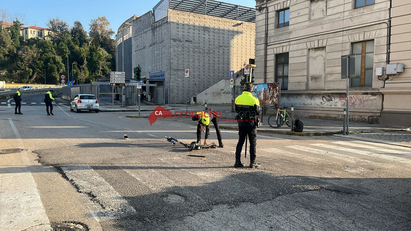 Il monopattino e la polizia locale sul posto