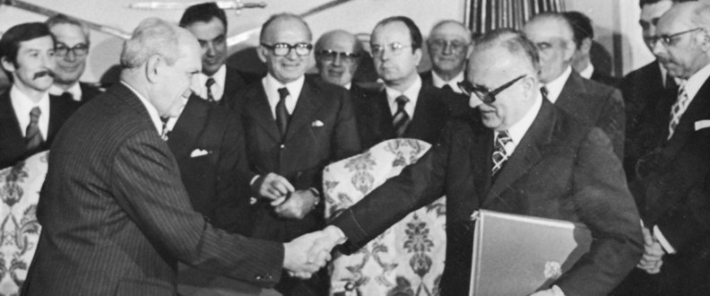 La storica foto della firma del Trattato di Osimo che avvenne in gran segreto il 10 novembre 1975 nella villa del conte Leopardi Dittajuti (credits Wikipedia)