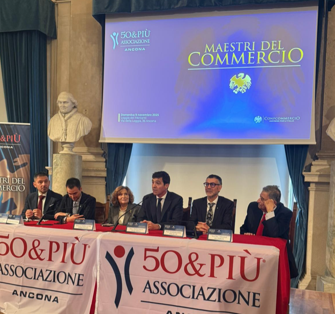 Alla cerimonia sono intervenuti, tra gli altri, il presidente della Regione Marche Francesco Acquaroli, l’europarlamentare Carlo Ciccioli, la presidente 50&Più Ancona Maria Luisa Martinuzzi, il presidente della Camera di Commercio delle Marche Gino Sabatini, il presidente Confcommercio Marche e Marche Centrali Giacomo Bramucci, il vicepresidente nazionale 50&Più Angelo De Amicis e l’assessore del Comune di Ancona Angelo Eliantonio.