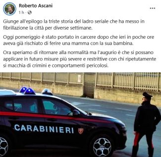 Subito, il sindaco Roberto Ascani, che nei giorni scorsi aveva espresso forte esasperazione per la situazione, ha commentato con un post sui Social: « Giunge all’epilogo la triste storia del ladro seriale che ha messo in fibrillazione la città per diverse settimane. Oggi pomeriggio è stato portato in carcere dopo che ieri in poche ore aveva già rischiato di ferire una mamma con la sua bambina. Ora speriamo di ritornare alla normalità ma l’augurio è che si possano applicare in futuro misure più severe e restrittive con chi ripetutamente si macchia di crimini e comportamenti pericolosi».