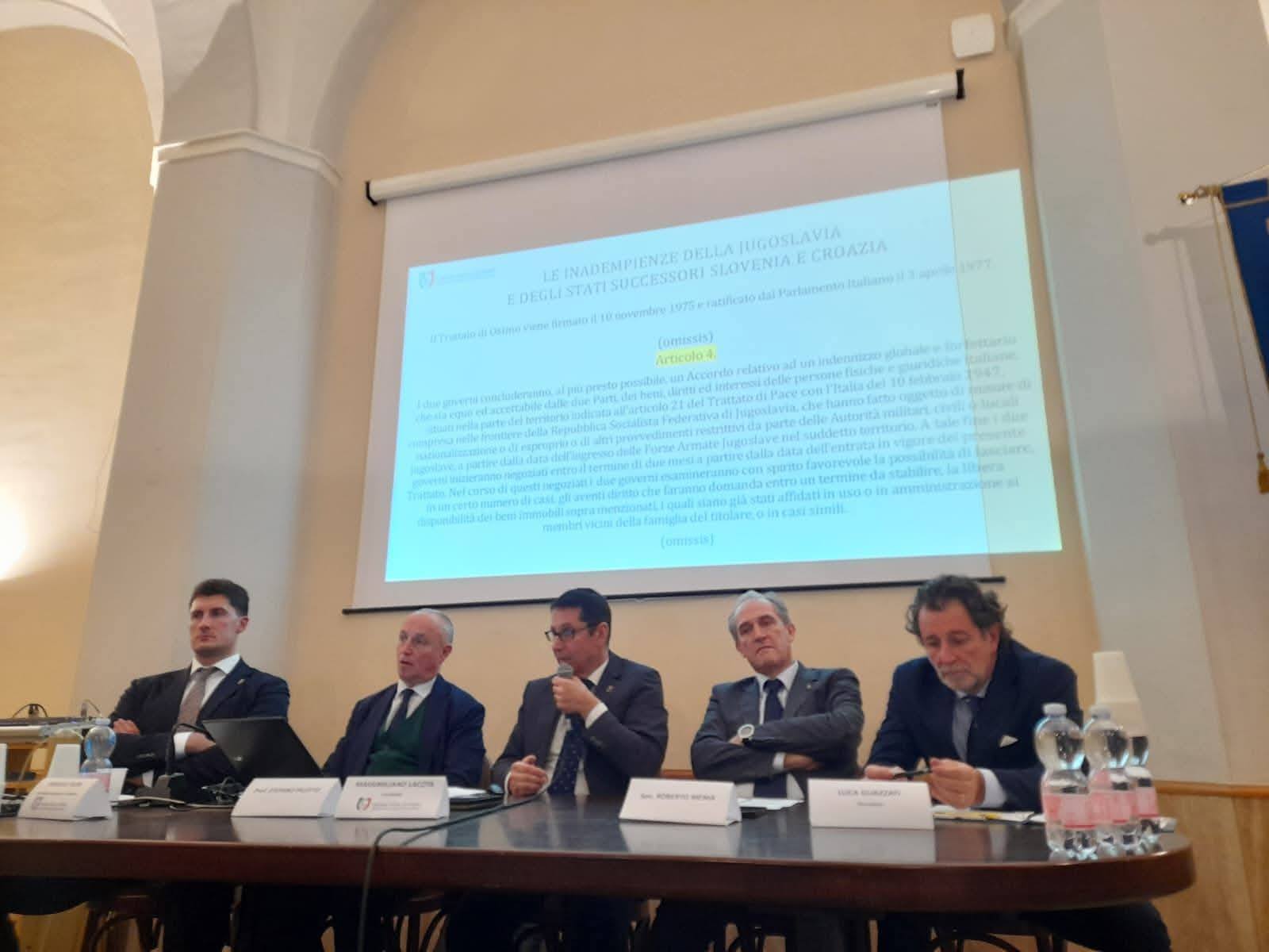 L’associazione in un comunicato ricorda come i relatori «hanno ben spiegato le vicende storiche e politiche che hanno portato alla firma del Trattato di Osimo il 10 novembre 1975, spiegando bene come sia il Trattato medesimo, così come il successivo Accordo di Roma del 1983 non siano stati rispettati dalla Jugoslavia prima, che ha versato solamente 17 dei 110 milioni di dollari di risarcimento previsti, e da Slovenia e Croazia poi che non hanno pagato nemmeno un centesimo rispetto a quanto dovuto, essendosi dichiarate eredi della defunta Repubblica federativa di Tito. Ribadiamo: il Trattato, per inadempienza delle controparti, deve essere denunciato dall’Italia e rinegoziato».
