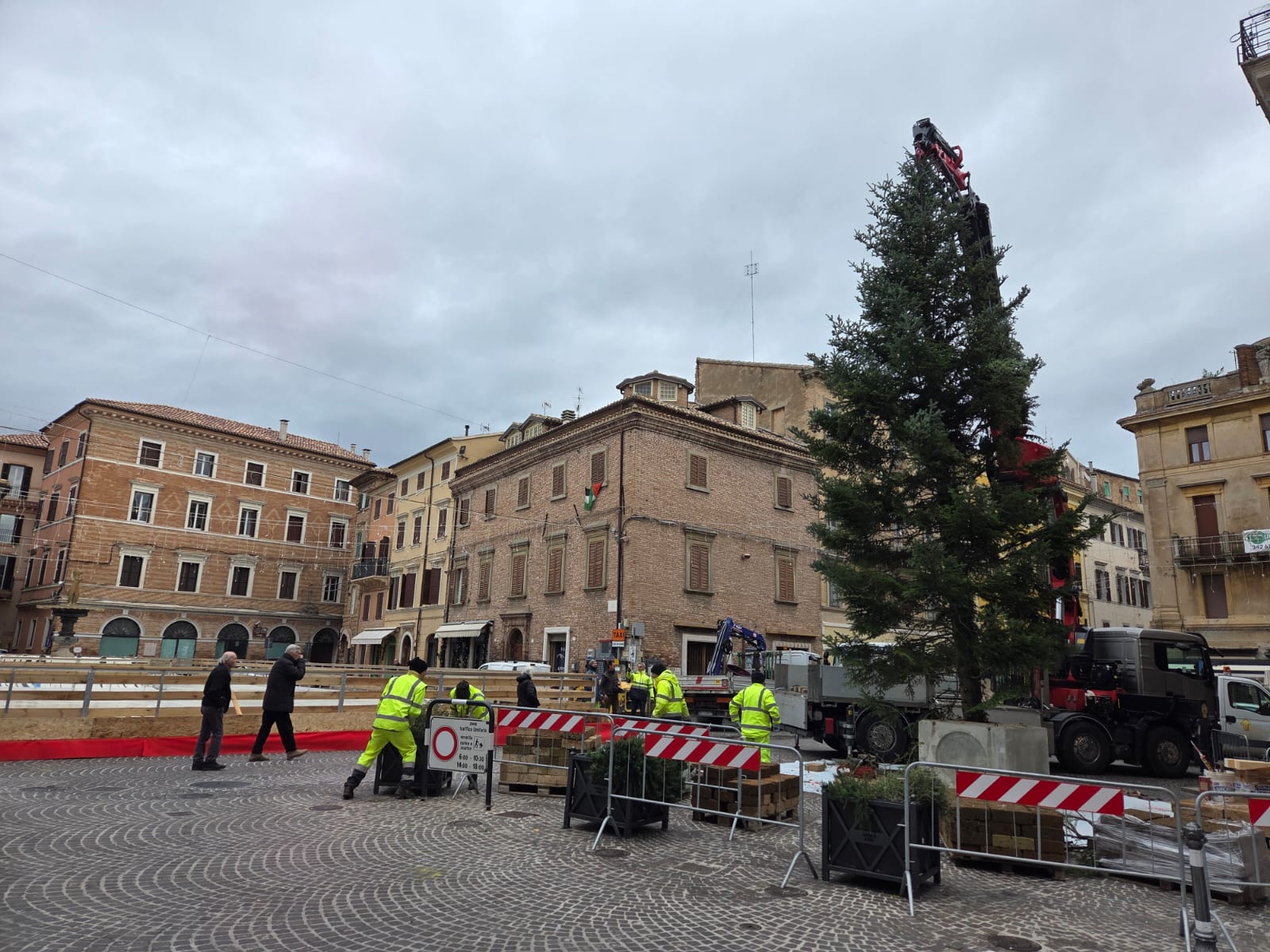 Operai al lavoro per sistenare l’albero di Natale in piazza Boccolino