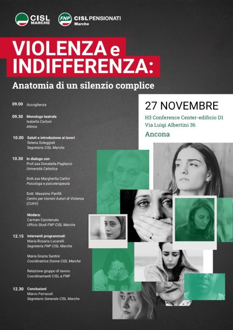 La violenza di genere resta una ferita profonda che attraversa la società e si alimenta di silenzi, omissioni e indifferenza. Per riportare al centro dell’attenzione pubblica la responsabilità collettiva nel contrasto a questo fenomeno, la Cisl Marche, insieme alla Fnp Cisl Marche, organizza l’incontro “Violenza e indifferenza. Anatomia di un silenzio complice”, in programma ad Ancona giovedì 27 novembre ore 9  presso l’ H3 Conference Center in via L. Albertini,36. L’iniziativa, che si inserisce nel percorso di sensibilizzazione “Riconoscere per Agire” avviato in occasione della Giornata internazionale per l’eliminazione della violenza contro le donne, si aprirà con un monologo teatrale dell’attrice Isabella Carloni, un momento artistico che darà voce alle storie di chi subisce abusi e sopraffazioni in contesti di indifferenza.
