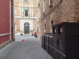 I cassontti pesa rifiuti nel centro storico di Osimo, sullo sfondo Palazzo comunale