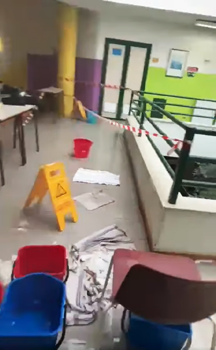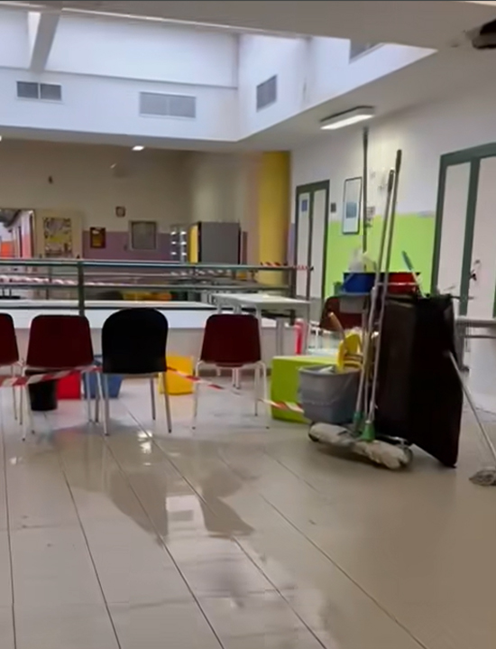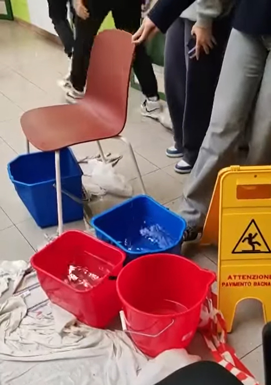 Secchi d’acqua e stracci al Corridoni Campana, giovedì scorso dopo una giornata di pioggia