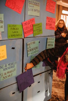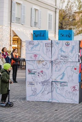 Un momento di grande partecipazione, tra anziani, giovani, adulti e bambini che hanno attaccato insieme i cartelli per descrivere una società altra. Le persone, insieme, hanno creato un movimento, rappresentante il dissenso del presente e il desiderio di ricostruzione di uno scenario nuovo. «Il flash mob, ben riuscito, è stato capace di rompere l’illusione del presente – spiegano gli organizzatori – creando uno spazio di realtà all’interno di una piazza circondata da addobbi pacchiani, esagerati e soprattutto molto costosi (si leggono cifre imbarazzanti), in una città che ha smesso di investire sul sociale, vetrina di eventi discutibili e lontani da ogni idea di cura. Un teatrino d’oro (o meglio di plastica) costruito per garantire le compere natalizie, che saranno probabilmente vissute con leggerezza da pochi, in una Senigallia che si porta il peso, tra i tanti, di una crisi abitativa importante».