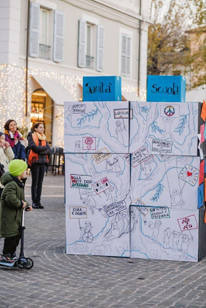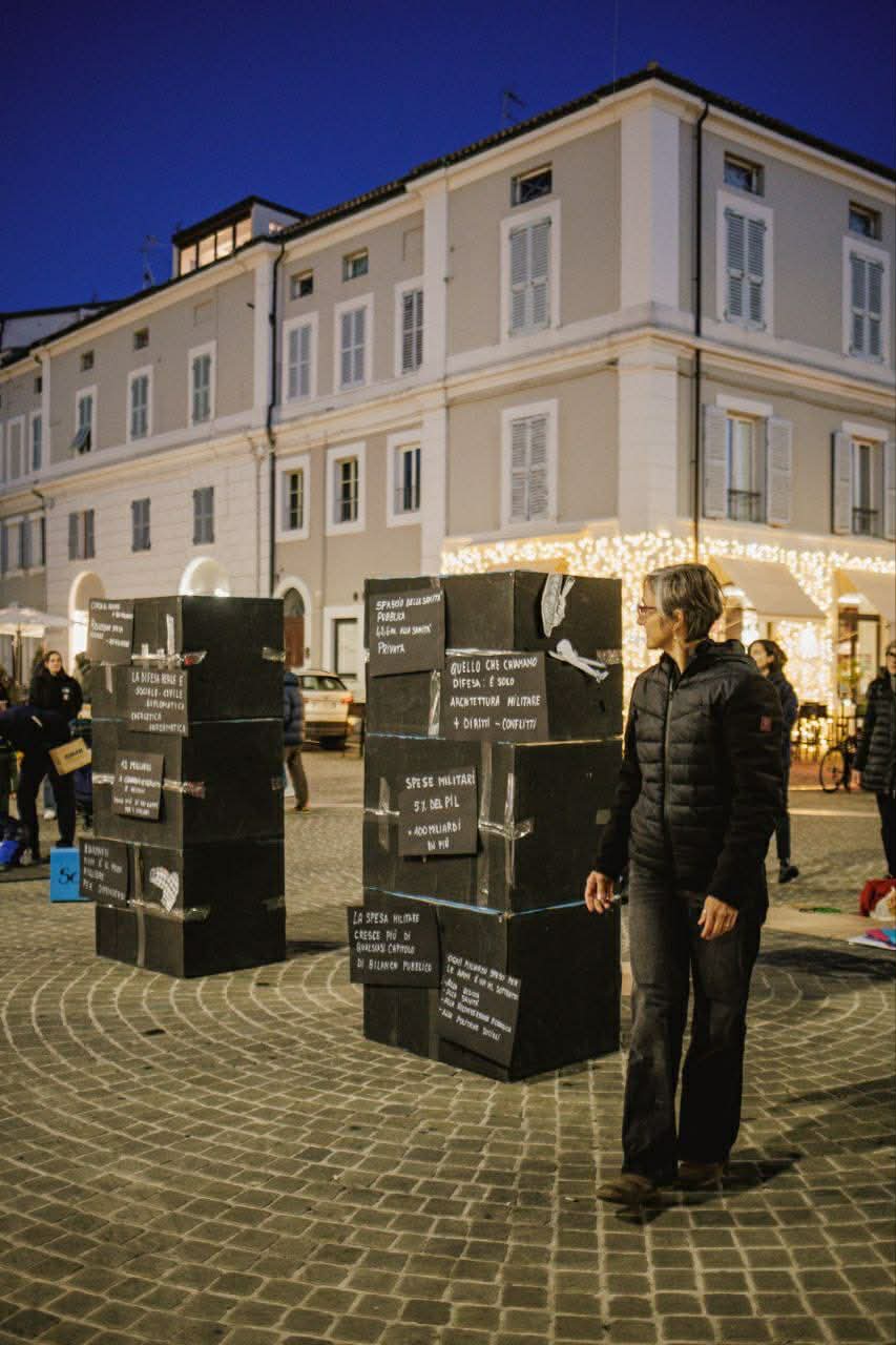 Tra il lusso delle luminarie si è svolto ieri pomeriggio in piazza Saffi a Senigallia un flash mob, contro l’economia di guerra e per lo stato di diritto. L’evento “Fuori la guerra dalla storia” è stato organizzato da diverse associazioni e collettivi: Rete femminista Marche molto + di 194, Collettivo Transfemminista Ortica, Anpi Senigallia, Spazio Autogestito Arvultura, Factory Zero Zero, Libera e Pedalata Senigallia. La prima tappa di un’iniziativa che attraverserà varie città della regione. La prossima è in programma il 6 dicembre a Jesi. Un lavoro corale che ha emozionato la comunità. I passanti si sono fermati a guardare e a partecipare. Un momento comunicativo e politico in cui coreografia, istallazione e musica hanno ribadito l’importanza di lottare per contrastare lo smantellamento dei diritti, la privatizzazione della sanità e la militarizzazione della scuola. L’economia del riarmo è stata rappresentata visivamente con due colonne nere, piene di cartelli che descrivono l’impatto che questa avrà sulle vite di tutte e tutti. In un secondo momento le colonne sono state buttate giù dalla collettività, dalle attiviste e ricostruite in una geometria colorata su cui si è svelato un grande disegno di un’artista senigalliese, che ritrae l’idea di una comunità di cura, orizzontale e garante dei diritti di tutti. Il pannello è stato poi riempito di rivendicazioni.