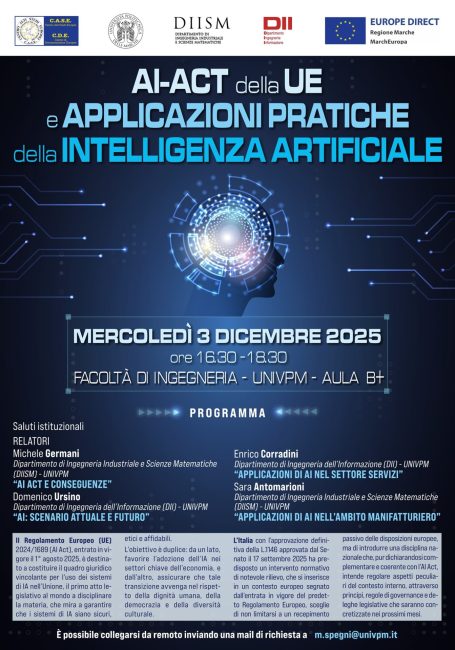 Mercoledì, dalle 16,30 alle 18,30, si terrà ad Ancona, all’aula B+ della Facoltà di ingegneria dell’Università Politecnica delle Marche (via Brecce Bianche, 12), il convegno “Ai-Act della Ue e applicazioni pratiche dell’intelligenza artificiale”.