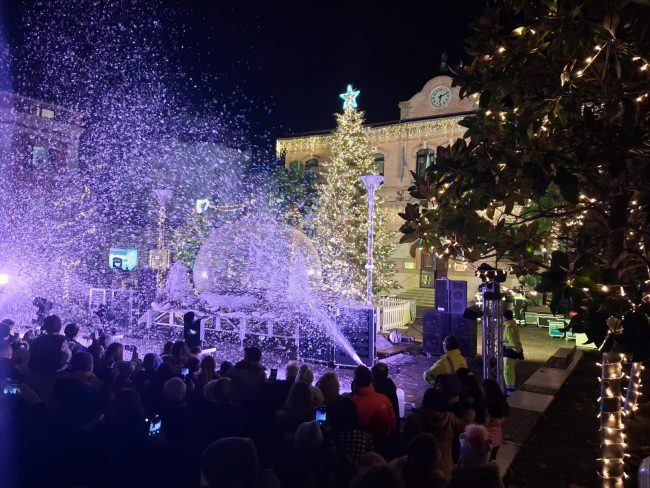 Alle 18, è stato il momento più atteso della giornata: il conto alla rovescia per l’avvio dello spettacolo e l’accensione dell’albero di Natale di piazza Mazzini, cui è seguito l’avvio simultaneo degli altri sette alberi diffusi nei quartieri e di tutte le luminarie cittadine. Una piazza gremita ha accompagnato l’illuminazione con entusiasmo, salutando l’inizio ufficiale del periodo natalizio sotto una pioggia di luci, neve e bolle di sapone, che ha trasformato la città in un grande palcoscenico festivo. Dopo il conto alla rovescia scandito dal palco dal sindaco Stefania Signorini, dall’assessore al Turismo Marco Giacannella guidati dal giornalista Maurizio Socci, l’attenzione del pubblico si è spostata sulla suggestiva performance della Boule à neige: due acrobate sospese all’interno di una grande sfera trasparente, tra luci, suoni e una danza di neve artificiale, hanno regalato uno spettacolo fiabesco che ha incantato adulti e bambini, concludendo il pomeriggio inaugurale in un clima di puro stupore.