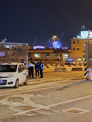 Il presidio della polizia locale oggi pomeriggio al varco della Repubblica per l’ingresso all’area sosta del porto