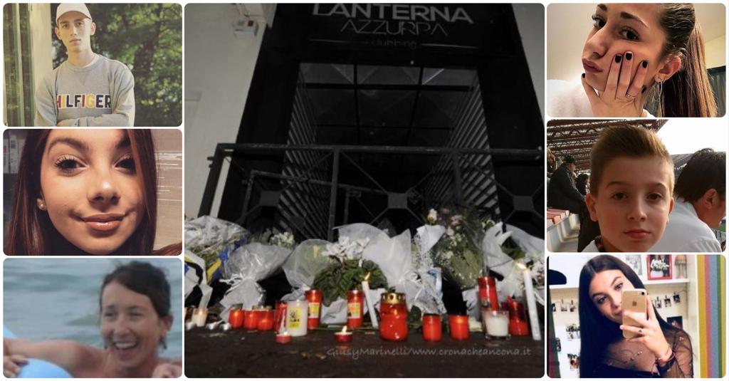 Emma Fabini, Mattia Orlandi, Daniele Pongetti, Benedetta Vitali, Asia Nasoni ed Eleonora Girolimini, le sei vittime della strage della Lanterna Azzurra di Corinaldo che oggi verranno ricordate a Senigallia.