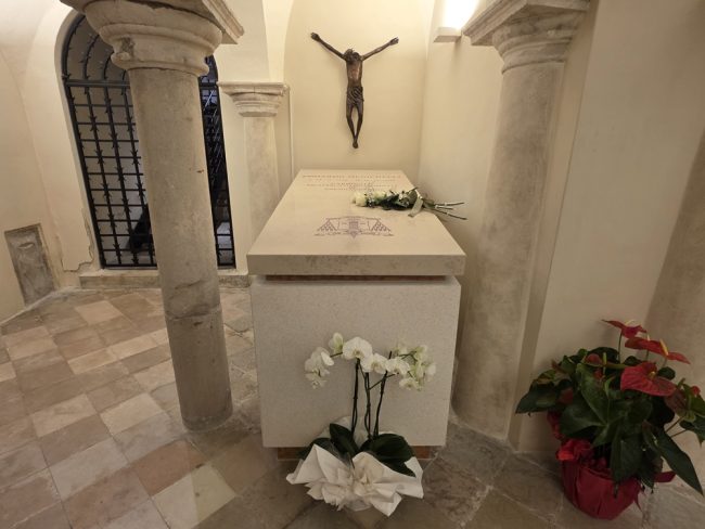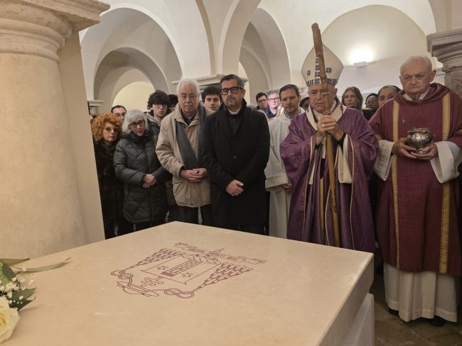 Benedetta la tomba del cardinale Edoardo Menichelli nella cripta della cattedrale di San Ciriaco ad Ancona. Questa mattina, alle ore 10.30, mons. Angelo Spina, arcivescovo metropolita di Ancona-Osimo, ha presieduto la Santa Messa in Cattedrale. Al termine della celebrazione, l’arcivescovo ha raggiunto la Cripta delle Lacrime, insieme ai familiari di Menichelli, al sindaco Daniele Silvetti e ai fedeli, e ha benedetto la tomba del cardinale con le seguenti parole: «Signore Gesù Cristo, riposando per tre giorni nel sepolcro hai santificato le tombe di tutti coloro che credono in Te così da renderle per noi, segno di speranza nella risurrezione. Concedi al nostro fratello Cardinale Edoardo, che deponiamo in questo sepolcro, di riposare in pace fino al giorno in cui Tu, che sei la risurrezione e la vita, lo farai risorgere e lo colmerai di splendore, perché alla luce del Tuo volto possa contemplare in cielo la luce eterna. Tu che vivi e regni nei secoli dei secoli. Amen».