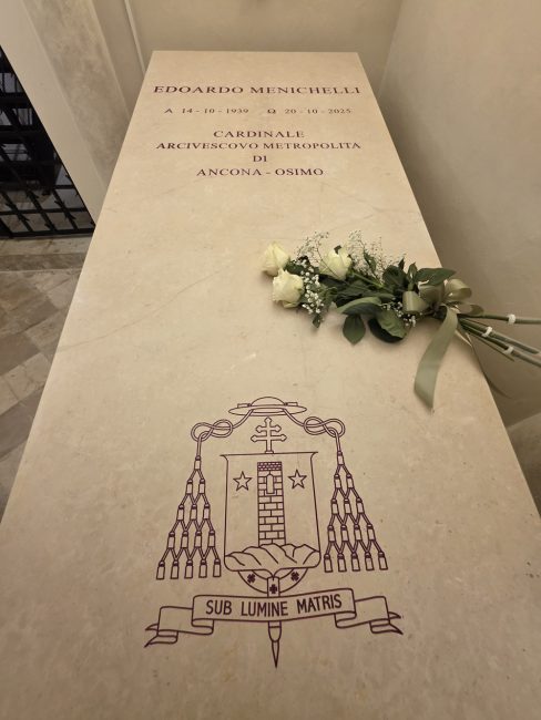 Il cardinale Edoardo Menichelli è deceduto il 20 ottobre 2025 a San Severino Marche. Le esequie sono state celebrate la mattina del 22 ottobre nel Santuario della Madonna dei Lumi a San Severino Marche. Dopo le esequie, il feretro è stato portato nella Cattedrale di San Ciriaco ad Ancona, dove Mons. Angelo Spina ha celebrato la Santa Messa di suffragio, alla presenza dei presbiteri, dei familiari del defunto e di numerosi fedeli. Al termine della celebrazione, il feretro è stato deposto nella Cripta delle Lacrime, in attesa della sepoltura, secondo la volontà espressa pubblicamente dal Cardinale e nel suo testamento. L’arcivescovo Angelo Spina e il vicario generale don Luca Bottegoni si sono attivati subito per ottenere tutte le autorizzazioni necessarie alla sepoltura.