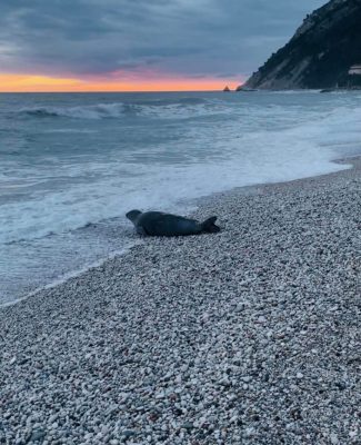 La foca monaca avvistata questa mattina sulla spiaggia di Portonovo
