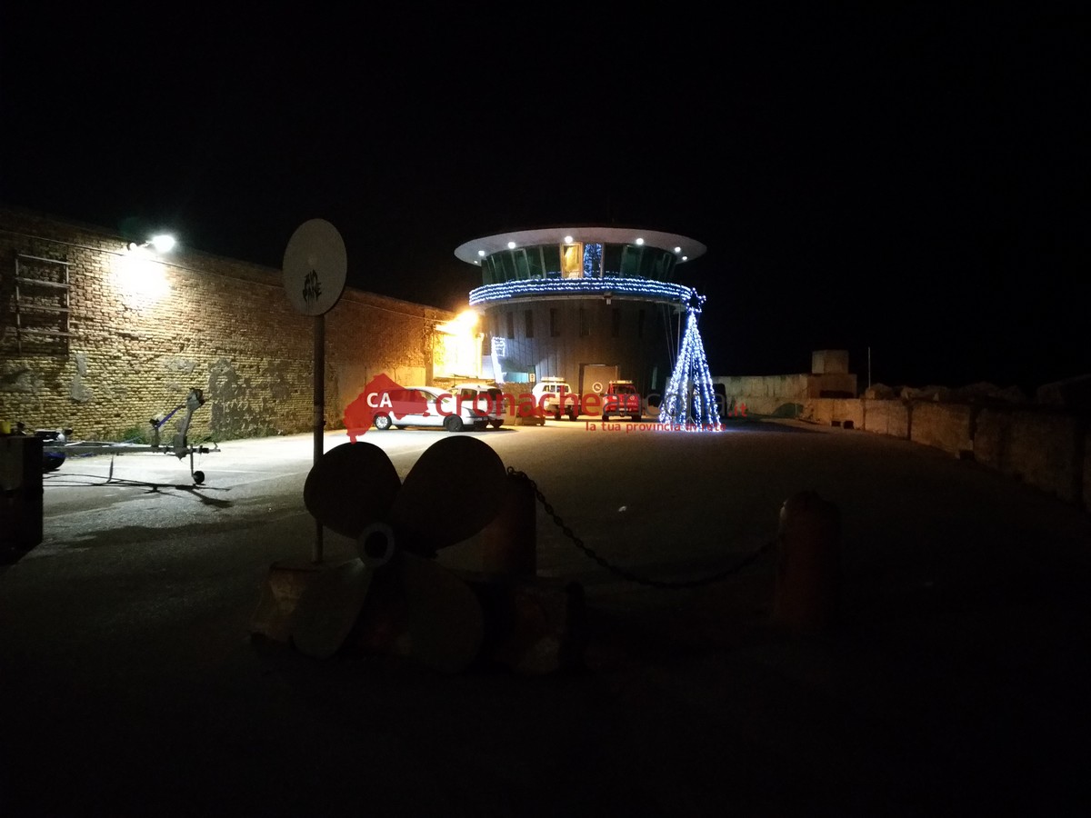 Posizionato davanti alla sede dei Piloti e degli Ormeggiatori, questa sagoma di luci azzurre rompe l’oscurità di un punto “isolato” e operativo del porto, trasformandolo in un angolo di pura poesia marittima.