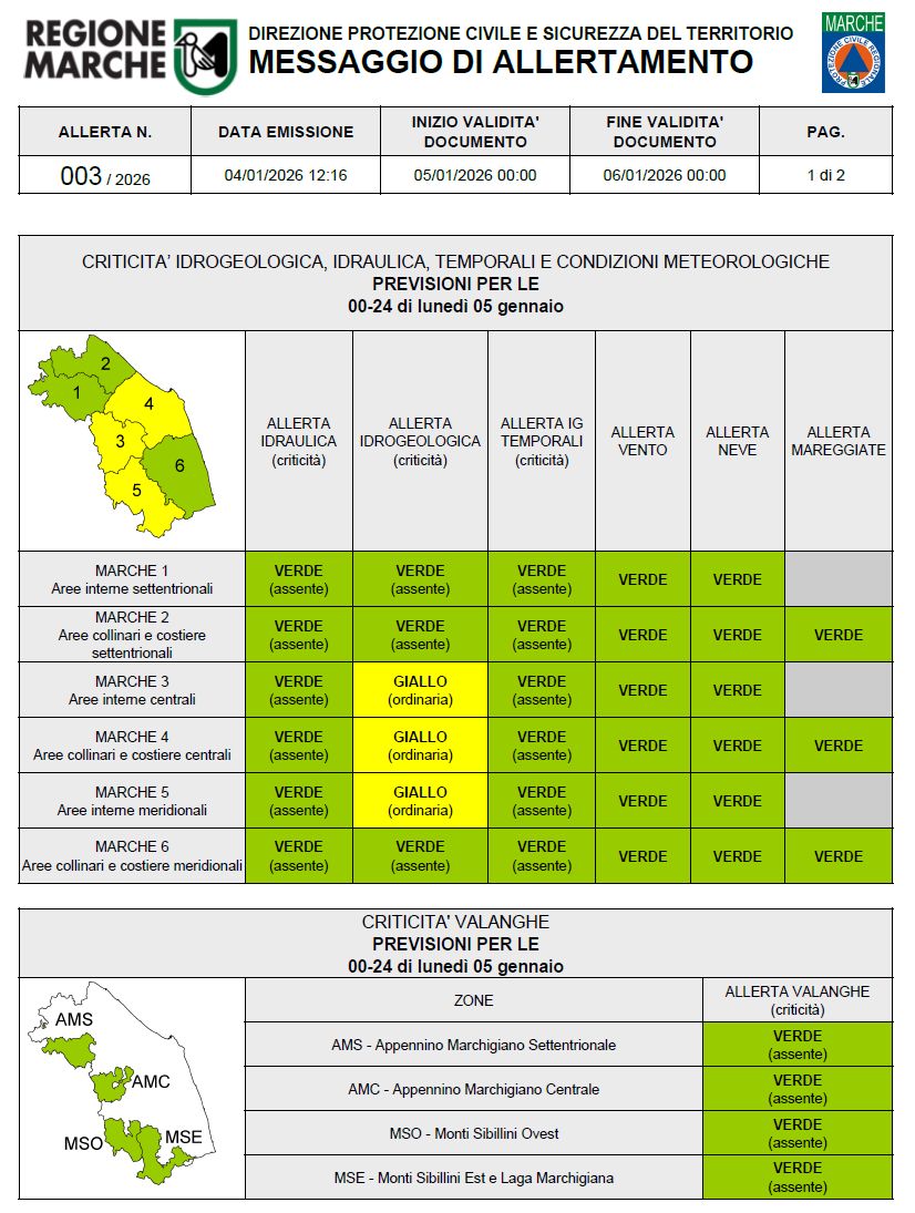 Alle 12:16 di oggi la Protezione Civile Regionale delle Marche, sulla base dei documenti previsionali emessi in mattinata dal Centro Funzionale Regionale, ha diramato un nuovo “Messaggio di allertamento” di livello “Giallo” per “Criticità idrogeologica” sulle Zone di allertamento 3, 4 e 5, con validità dalle 00:00 alle 24:00 di domani, lunedì 5 gennaio 2026.