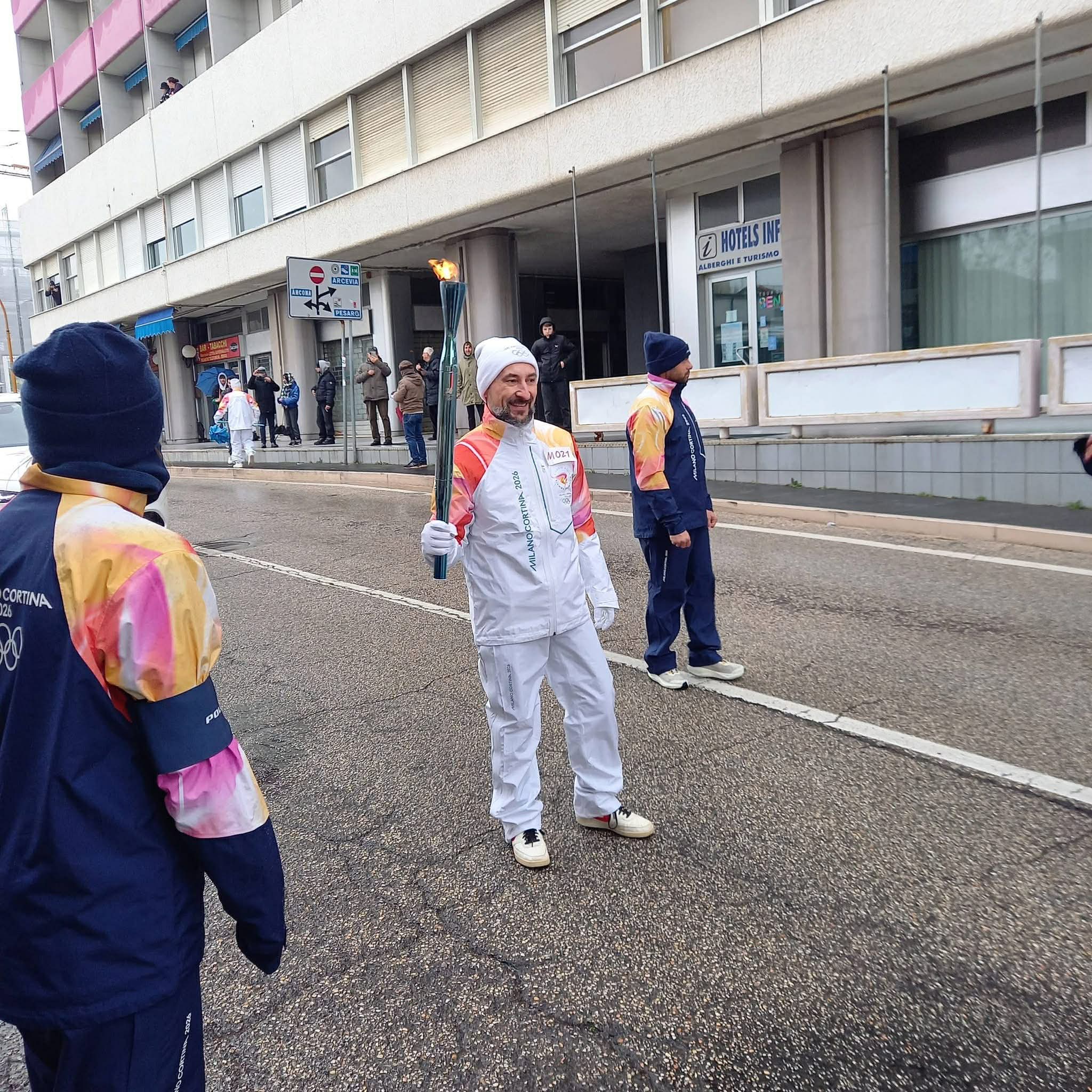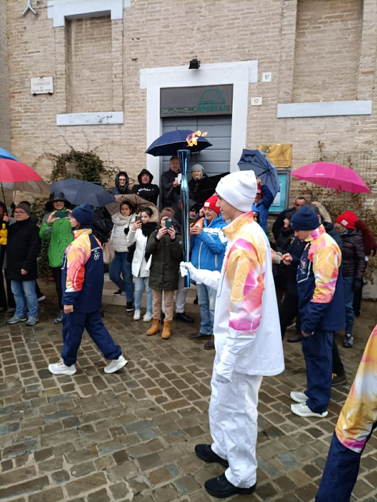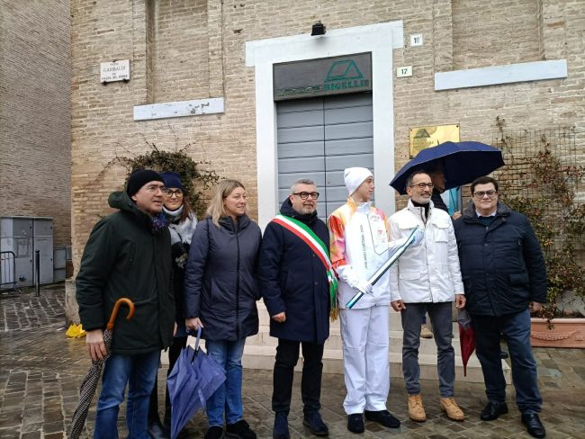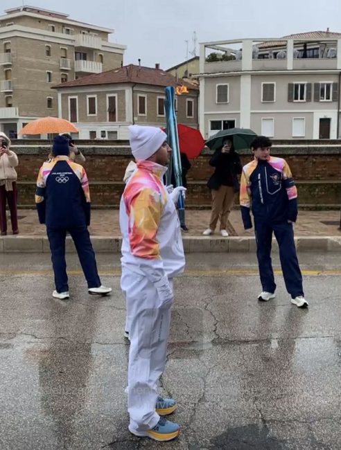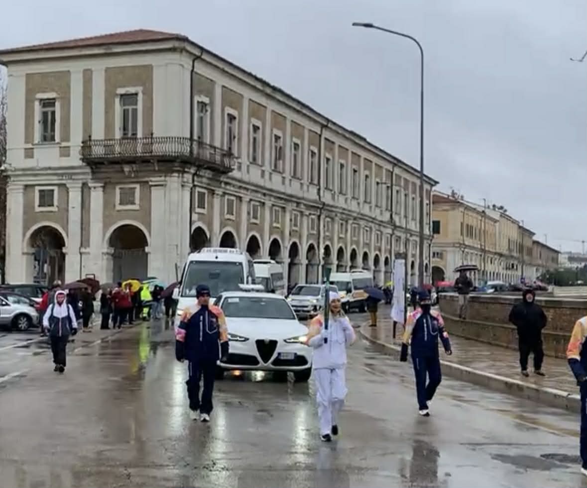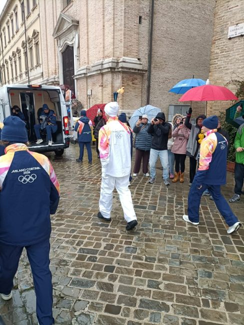 La pioggia di stamattina non ha fermato il passaggio della Fiamma Olimpica da via Podesti a via Sanzio con tappa in centro storico.