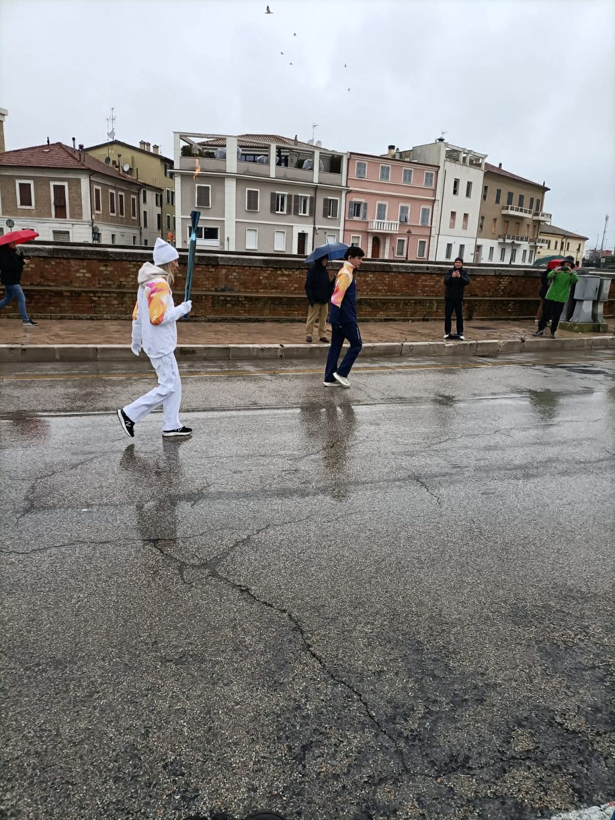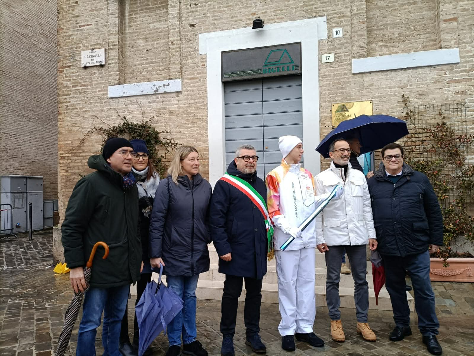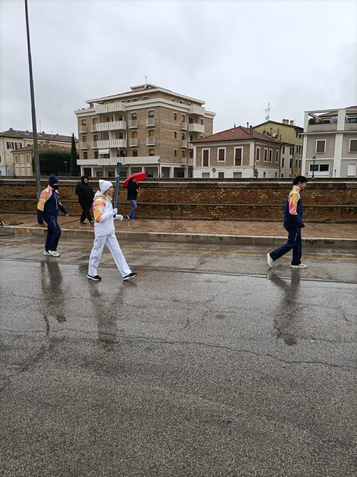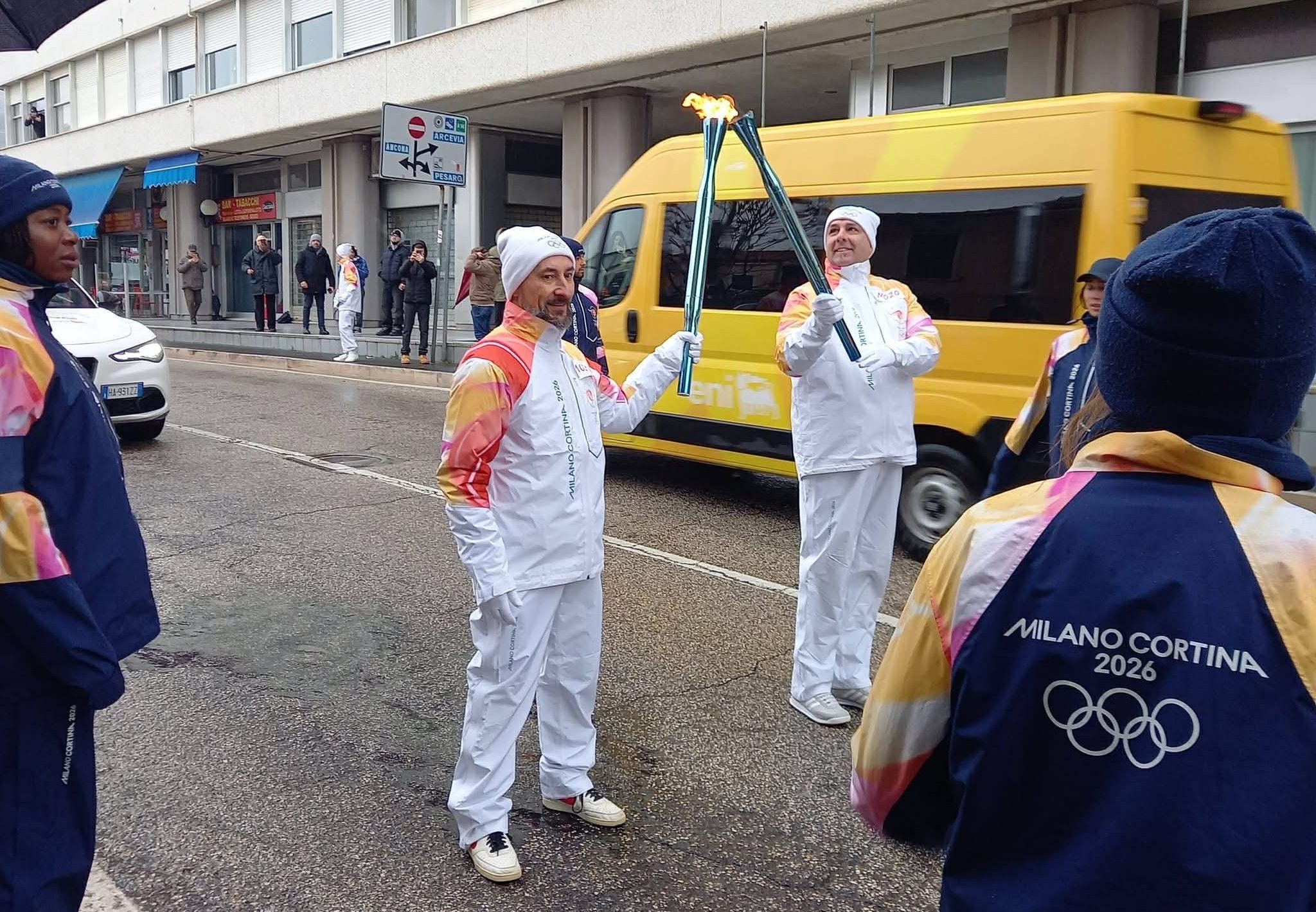 La pioggia di stamattina non ha fermato il passaggio della Fiamma Olimpica da via Podesti a via Sanzio con tappa in centro storico.
