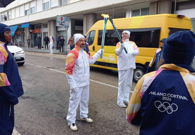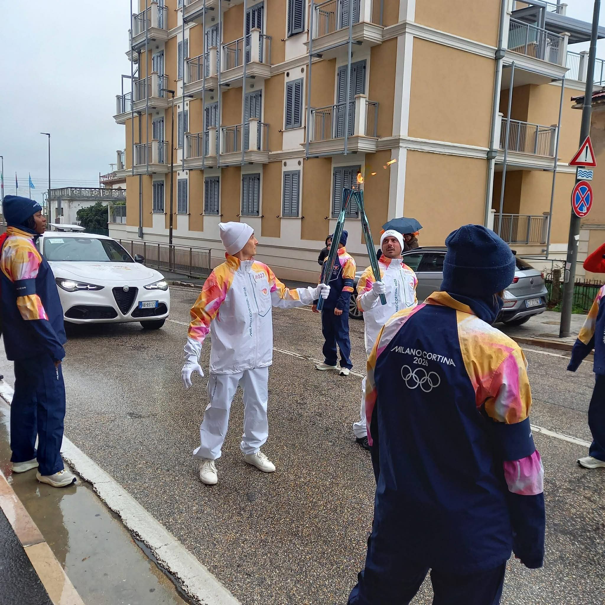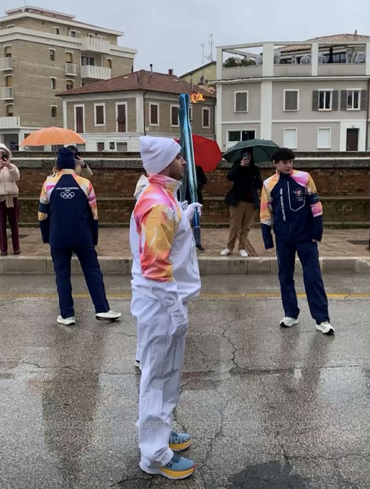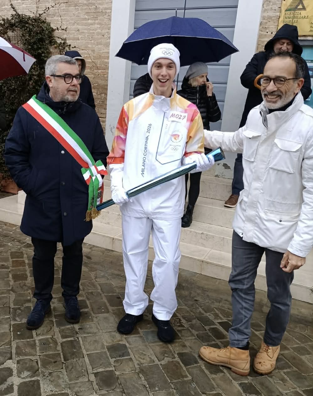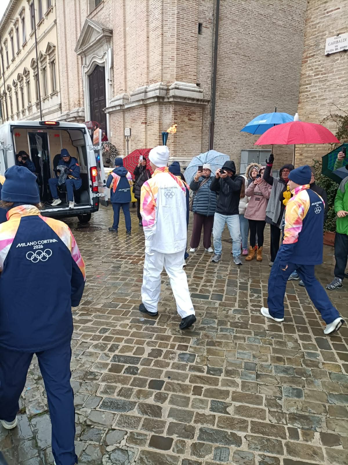 La gente ha atteso, munita di ombrello, l’arrivo dei tedofori, che si sono dati il cambio per proseguire poi verso la tappa successiva, sotto la supervisione del comitato olimpico Milano-Cortina ’26.