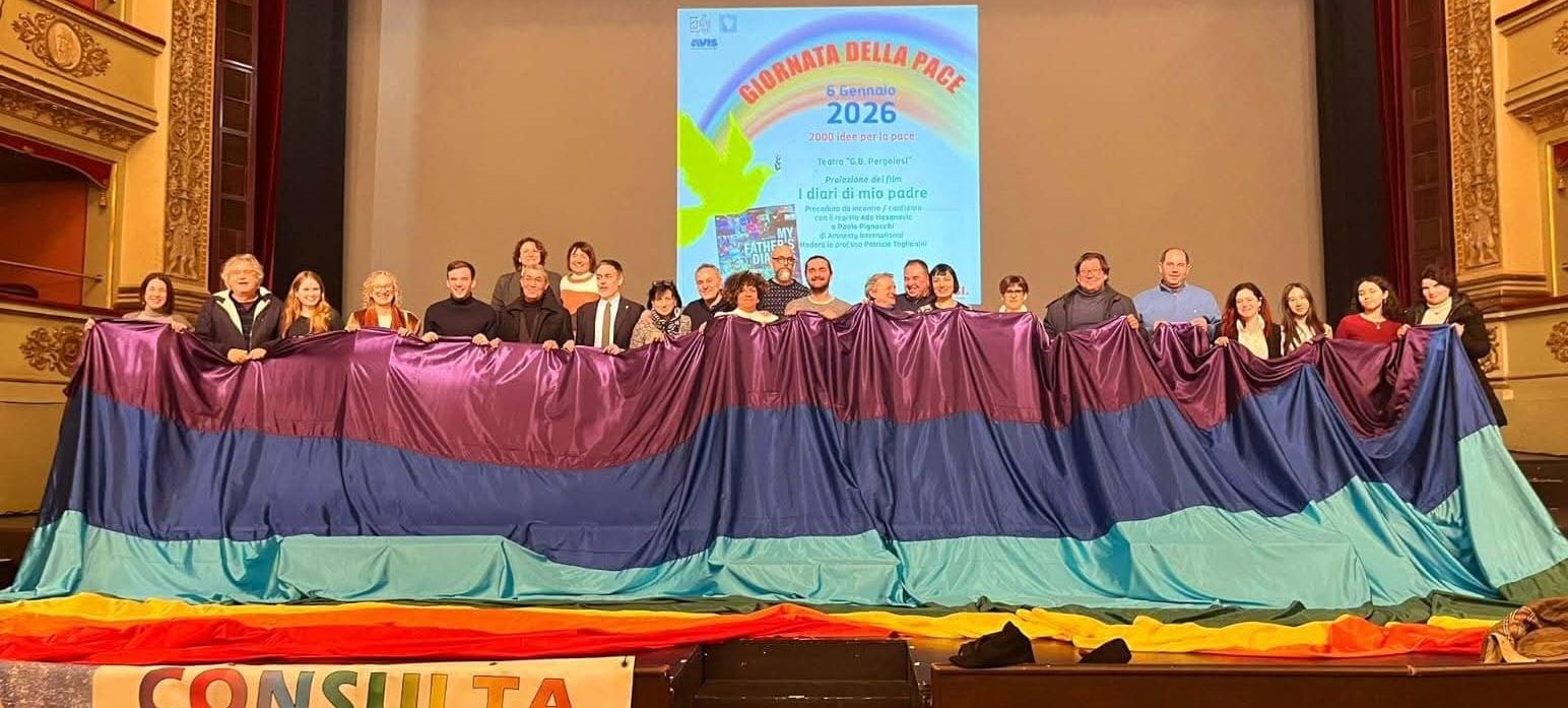 «Davvero toccante questa testimonianza ed il messaggio lasciato al regista dal padre, di non odiare, ma ricucire le relazioni lacerate. Questa la condizione per mantenere un futuro di pace. – sottolinea una nota del comune di Jesi – Grazie a chi ha lavorato per rendere possibile questo momento, grazie agli ospiti intervenuti, grazie a chi, nonostante il maltempo, non ha voluto perdere questa bella occasione, riempendo il teatro. Sul palco distesa, a simboleggiare questa volontà di costruire e percorrere insieme strade e sentieri di pace, la mega bandiera della pace, cucita per questa giornata dalla Associazione Amad di Ancona, impegnata nell’inclusione sociale, lavorativa ed abitativa di migranti e di persone fragili del territorio. Bandierone che sarà presente anche al corteo, rinviato, a causa del maltempo, a domenica 11 gennaio e che si svolgerà partendo alle 10:30 da Piazza Pergolesi, con orari e modalità già previste per il 6. Bambini, bambine vi aspettiamo numerosi, anche insieme alle befane, per consegnarvi le bandiere preparate dall’Avis di Jesi, da sempre partner prezioso sostenitore dell’iniziativa, e raccogliere i vostri messaggi di pace da inviare ai vostri coetanei vittime di guerre e povertà».